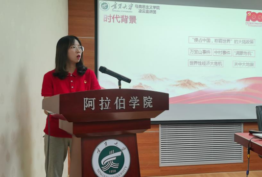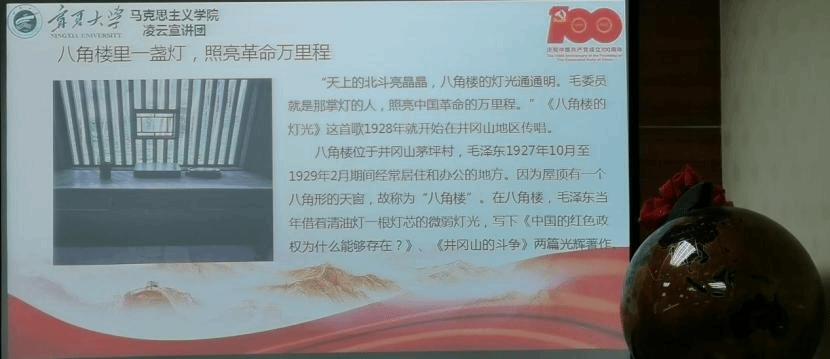 宣讲团第二组成员讲授的专题是“井冈星火,开辟革命道路”。首先,华悦同学以时间为线索为我们清晰梳理了党通过三大起义而创建革命军队的艰辛历程,重现了那段枪林弹雨的日子。他的宣讲慷慨激昂,内容丰富,使阿院学子受益匪浅。