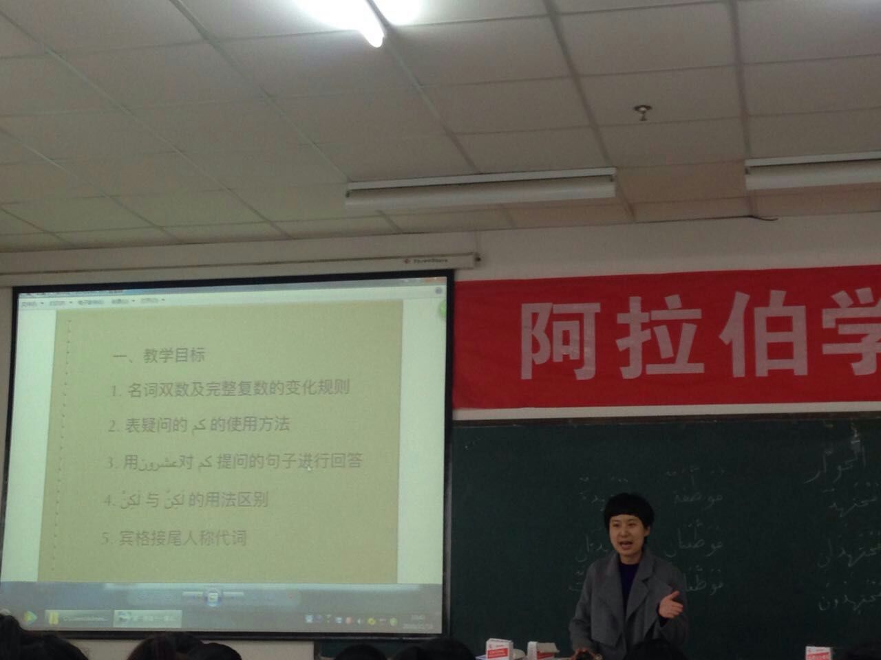 第一堂课由丁萍老师和王艳老师主讲,时间是上午第二小节课,地点在贺兰山校区1教d103教室,主讲课程是基础阿语Ⅱ。在课堂上,丁萍老师授课节奏紧凑,授课内容丰富,课堂整体感染力极好。王艳老师在授课过程中,师生积极互动,拓展了同学们的自主学习能力,一边讲授新的知识点一边复习旧知识点,授课方式特色明了。