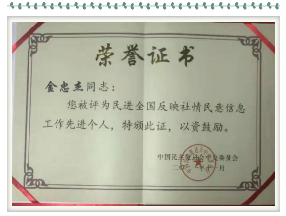 委员会副主委马青荣获“民进全国反映社情民意信息工作先进个人”。
