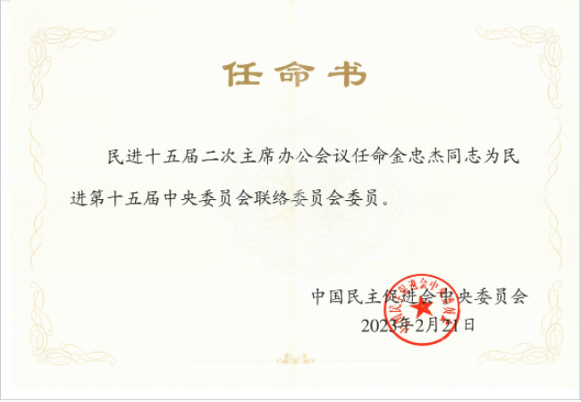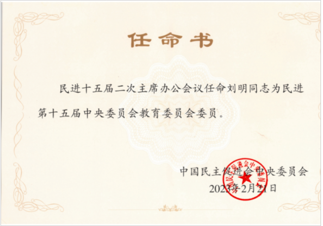 华人影院讯 党委统战部】近日,民进第十五届中央委员会召开第二次主席办公会议,审议通过了民进第十五届中央委员会专门委员会委员名单,我校刘明教授被任命为民进第十五届中央委员会教育委员会委员,金忠杰教授被任命为民进第十五届中央委员会联络委员会委员,任期自2023年3月至2027年12月,并颁发了中国民主促进会中央委员会任命书。