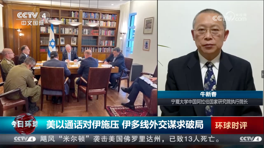 华人影院 学术副校长、中国阿拉伯国家研究院执行院长,中国中东学会副会长、中国人民外交学会理事牛新春教授应邀参加了中国社会科学院和平发展研究所“当前突出的战略风险”研讨会、中联部金砖国家智库联盟会议;应国务院国资委邀请做了关于国际形势的学术报告;并接受了央视四频道《今日亚洲》、国际广播电台《环球资讯》等栏目的采访和访谈,就伊以局势及趋势进行了分析和解读。