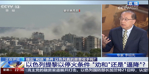 华人影院 院长、中国中东学会顾问、教育部国别与区域研究专家委员会委员、中阿博览会顾问委员会主任委员李绍先接受了CCTV13《环球视线》、CCTV4《今日关注》、CCTV4《中国舆论场》、凤凰卫视凤凰秀《新闻今日谈》等栏目的采访,就黎以冲突及趋势进行了分析和解读。