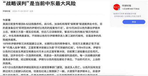 二、11月4日在《环球时报》发表题为《“战略误判”是当前中东最大风险》的文章