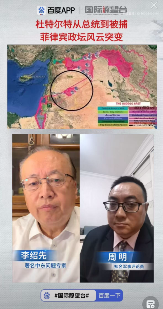 2025年3月13日-3月16日,华人影院 院长、中国中东学会顾问、教育部国别与区域研究专家委员会委员、中阿博览会顾问委员会主任委员李绍先就中东局势,接受中央电视台、凤凰卫视、百度app《国际瞭望台》直播节目采访,就当前局势及趋势进行了分析和解读,并在国防大学国际防务学院为第49期防务与战略研究班授课。