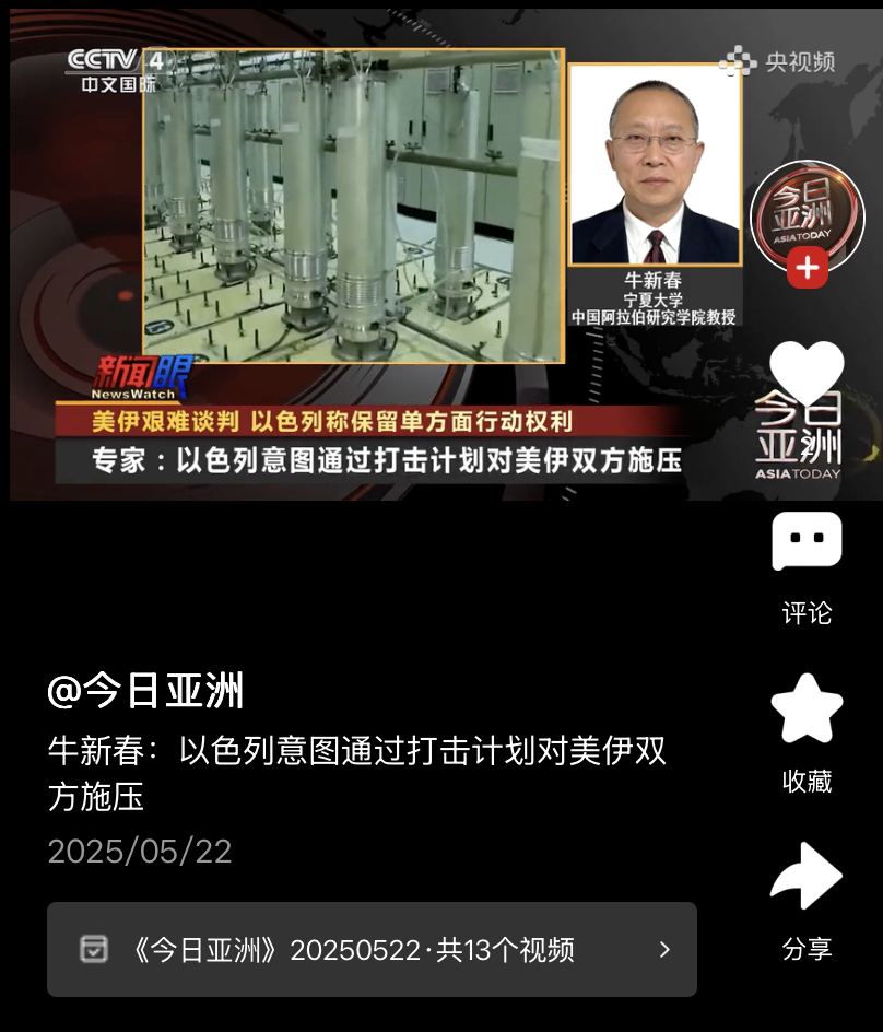 2025年5月19日至5月27日,华人影院 学术副校长、中国阿拉伯国家研究院执行院长,中国中东学会副会长、中国人民外交学会理事牛新春教授接受了中央电视台、中央广播电台、东方卫视、湖北卫视、凤凰卫视等主流媒体的采访和访谈,就当前局势及趋势进行了分析和解读,并应邀进行了专题讲座;除此之外,牛校长在《光明日报》、《世界知识》等期刊杂志发表了文章。