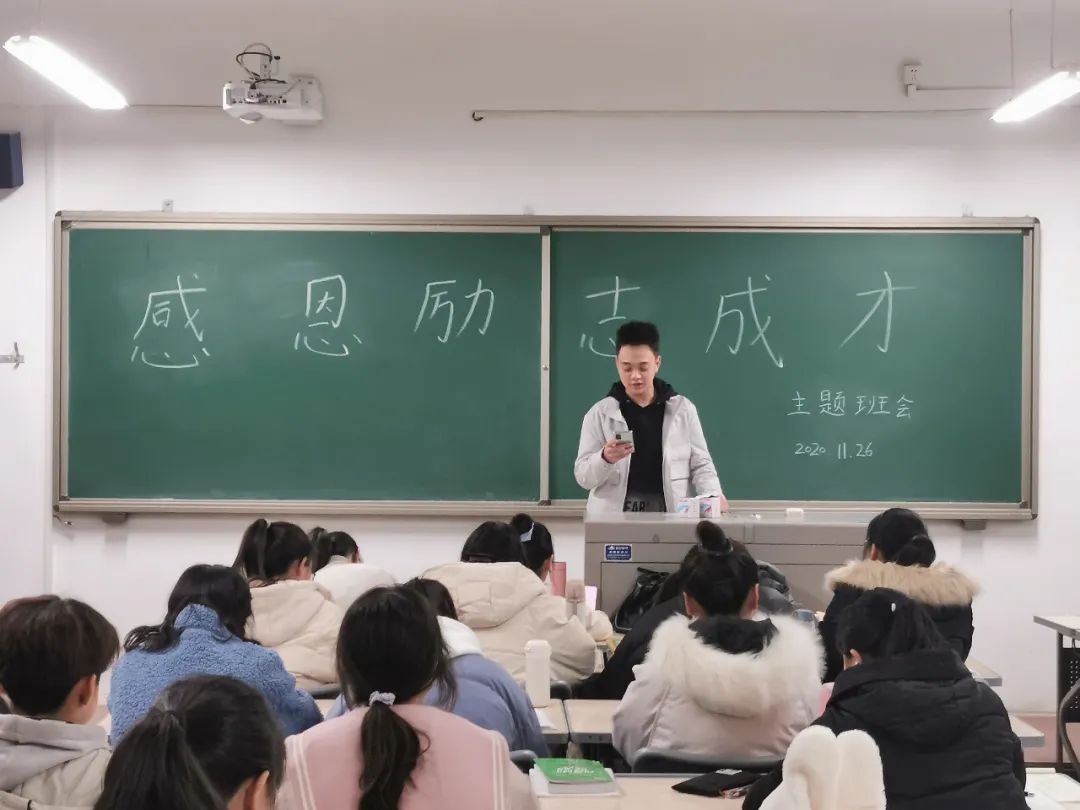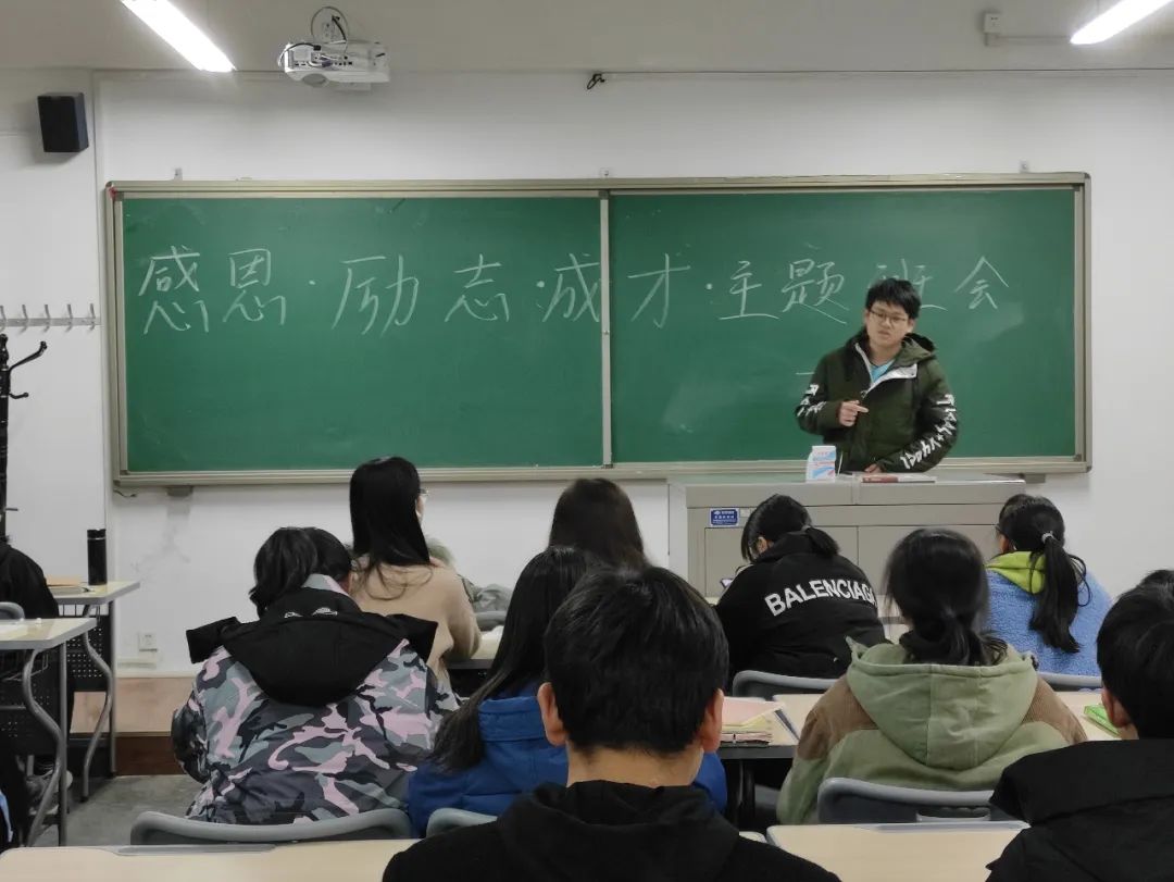 组织各班级在知行楼六楼开展“感恩”“励志”“成才”主题班会,2019级与2020级全体同学参加,各班班长主持本次班会。